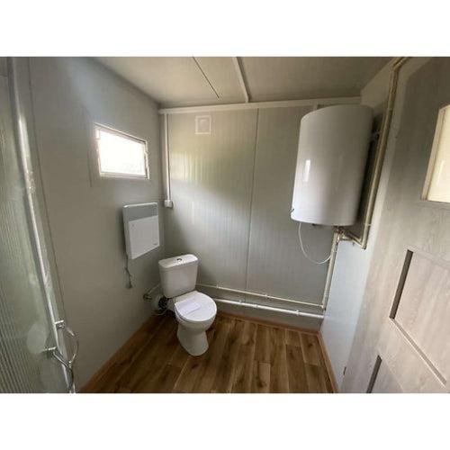 Comodidad sin concesiones: Equipado con un bloque sanitario completo que incluye WC, ducha y lavabo, nuestro contenedor le ofrece un confort óptimo en el día a día. La cocina, funcional y equipada, le permite preparar sus comidas con facilidad.